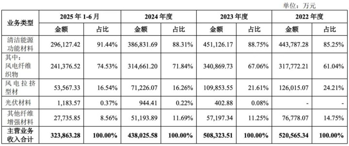 公司主要产品为清洁能源功能材料和其他纤维增强材料,其中清洁能源功能材料收入占营业收入比例超过 80%,清洁能源功能材料根据下游应用领域分类包括风电叶片材料和光伏材料等;
