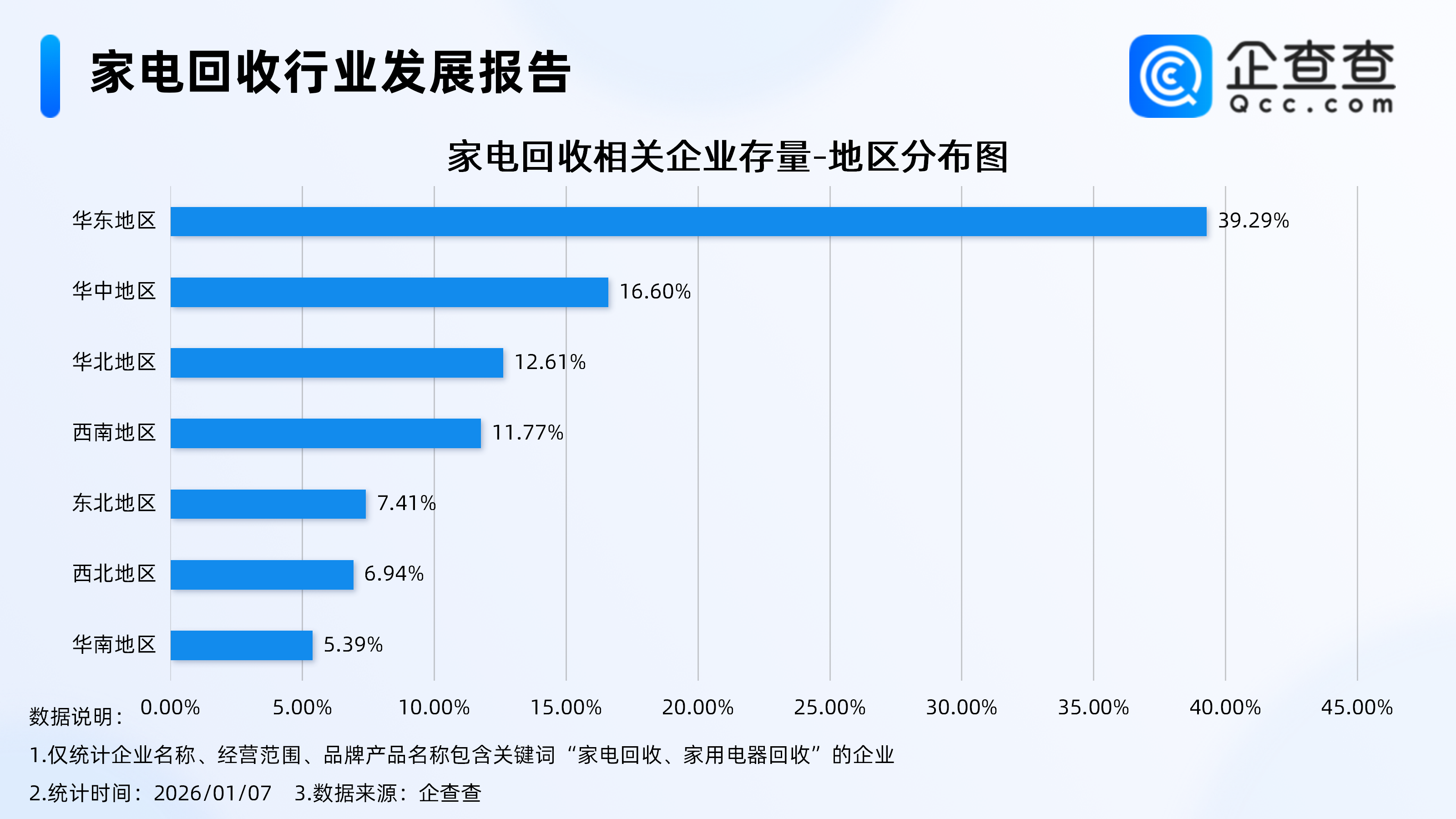 企查查数据显示,截至1月7日,国内现存家电回收相关企业6977家。从经营时间来看,现存家电回收相关企业多为老牌企业,成立年限在10年以上的相关企业最多,占比超四成,达44.89%。其次,在5-10年的相关企业占比43.87%。2.相关企业多集中分布在华东地区